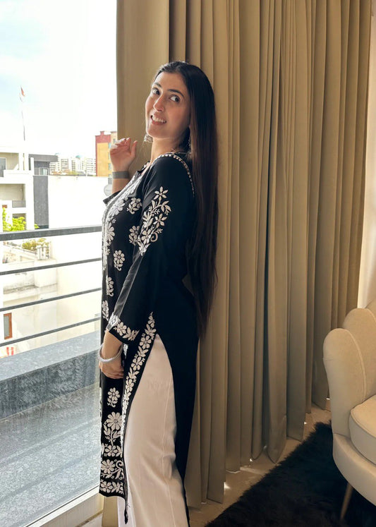 Black Women's Regular Fit Chain Stitch Work Cotton Kurti Top and Pant Set