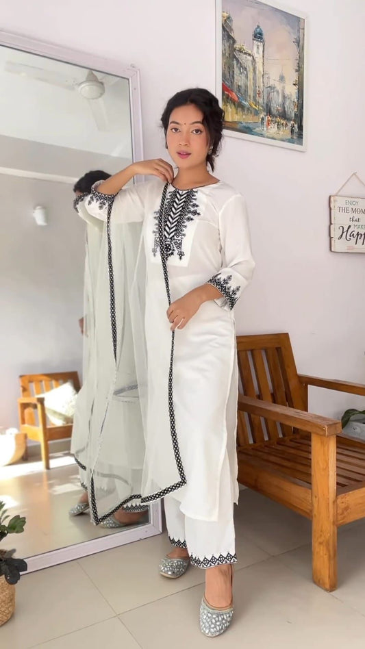 White Women Maslin top with cotton thread embroidered work stitched Kurta with Palazzo & Dupatta Set