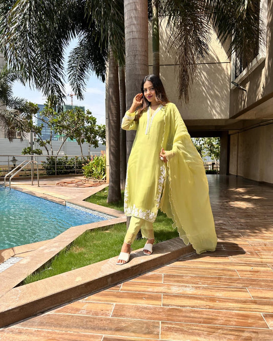 Luxurious Chikankari Embroidered Faux Georgette Top & Pant with dupatta Set