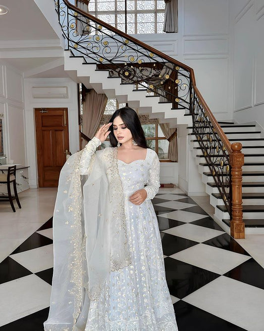 White Colour Faux Georgette With Sequence Work Party Wear Anarkali Gown With Silk Orgenza Dupatta