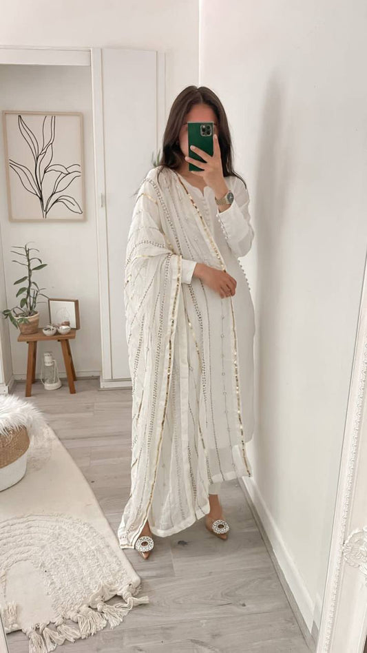 WHITE DESIGNER GEORGETTE EMBROIDERY JHALAR LACE TOP BOTTOM WITH DUPATTA OCCASION WEAR KURTA