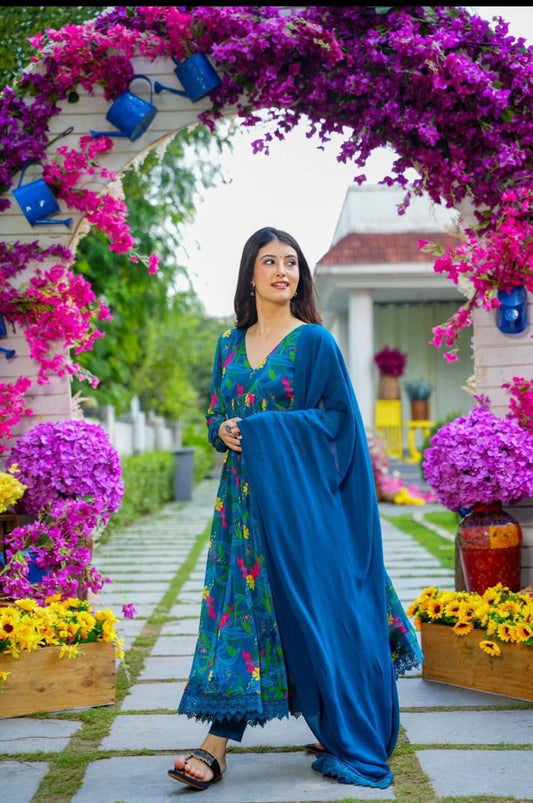 Beautiful Gorgette Maltiprint and petterned Anarkali Suit pant with Nazneen Dupatta, Party Wear Suit Set