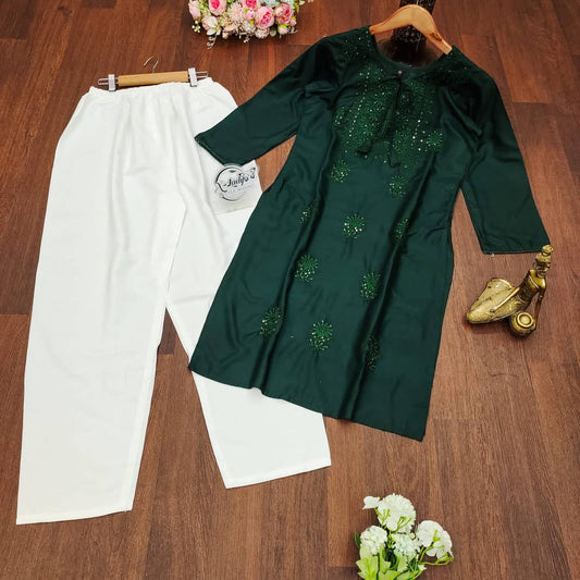 Cambric Cotton Kurti & Pant Set with Multi-Sequin Embroidery – 2-Piece Pair