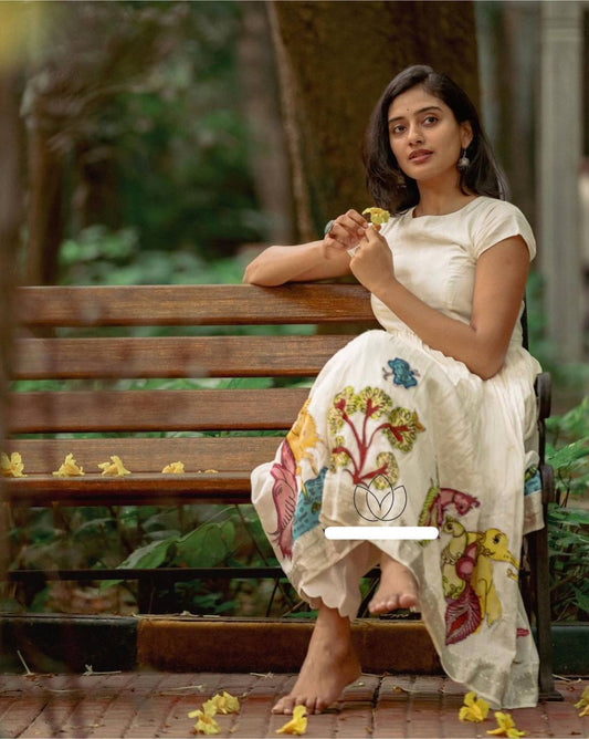 Creme South Indian Gown With Kalamkari Print in Chent Crepe Ready to Wear