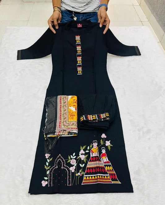 Womans Casual Wear Color Thread Work Kurti Pant With Dupatta