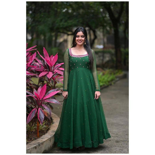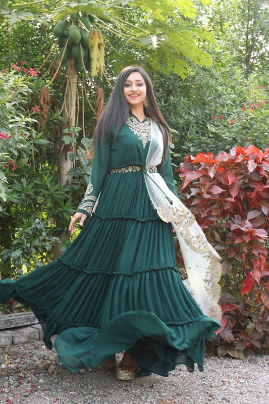 Women's Green Color Full Stitched Faux Georgette Gown with Santoon inner and Net Dupatta Embroidered Gown