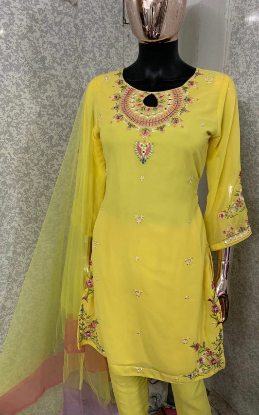 Women's Yellow Faux Georgette Embroidered Straight Kurta Pant Set With Dupatta