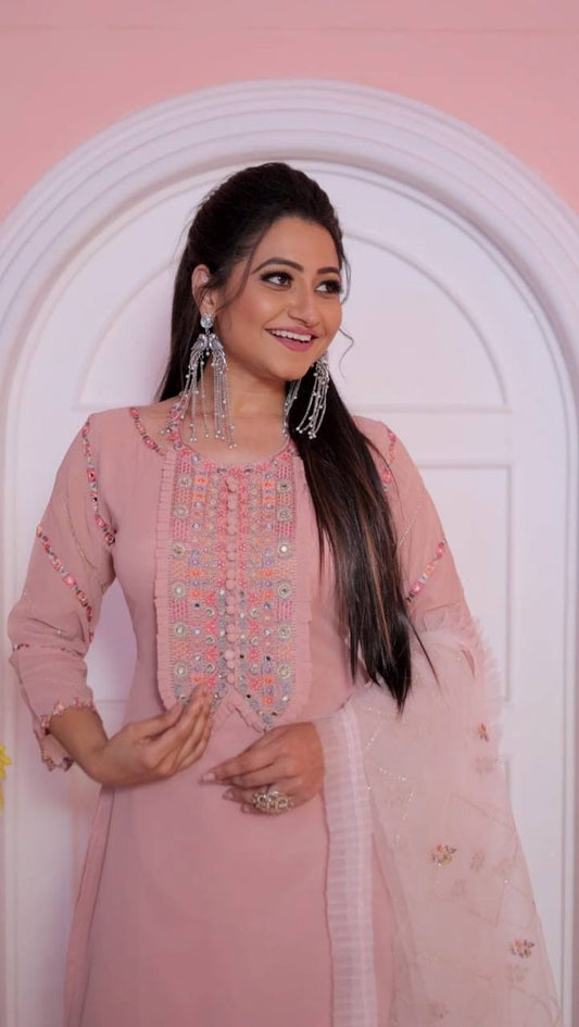 Pink Faux Georgette Embroidery worked Afghani KurtI, Bottom For Girls And Womens