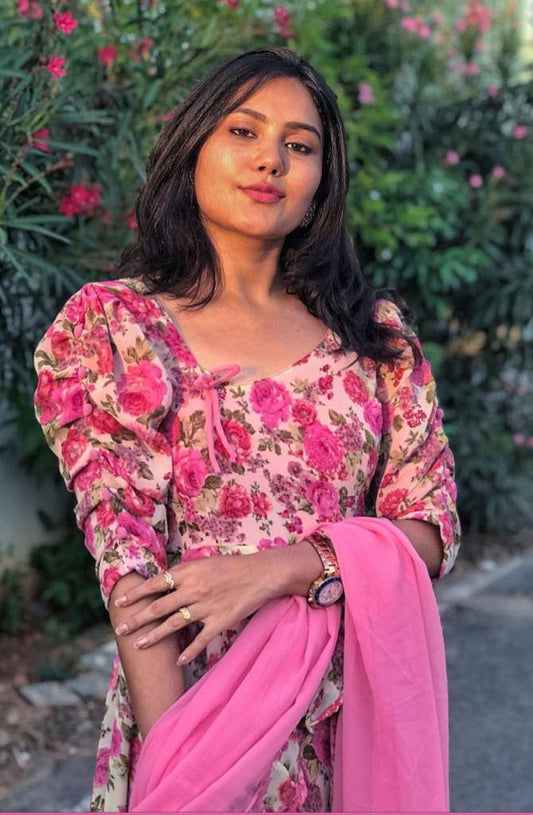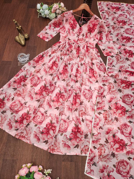 Beautiful Women Georgette Floral Printed V-Neck Anarkali Gown Dress For Girls & Women