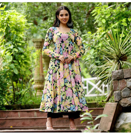 Black Trendy Style Anarkali Organza Gown New Look Attractive Georgette Beautiful Flowers Printed Kurti With Dupatta By Dealbazaars