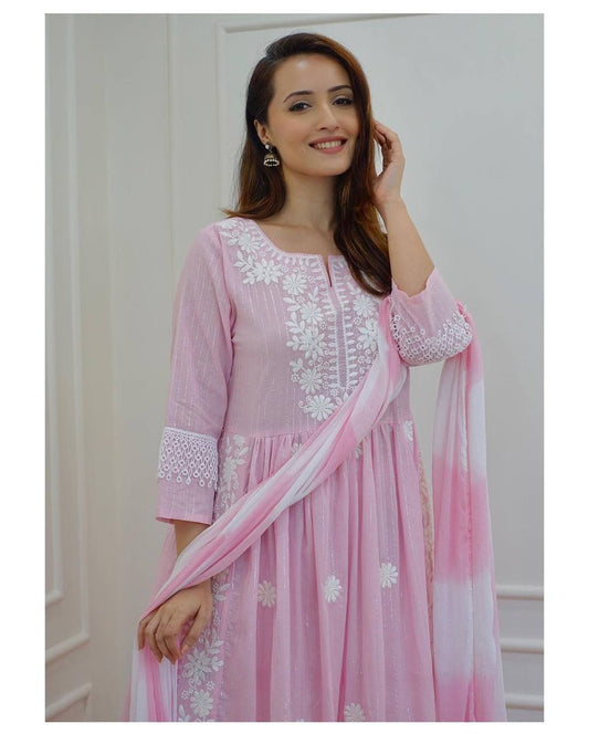 Pink & White Coloured Pure Cotton with Elegant Chikankari Nayracut Women Designer Kurti with Pant & Dupatta