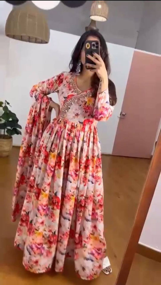 Womens Printed Georgette Ethnic Wear Comfortable Round Neck Designer Gown with Dupatta