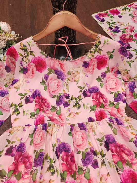 Multiple Flowers Printed Fox Georgette Digital Printed Maxi Dress With Plazo Pent