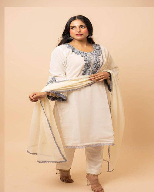 Women's White Faux Georgette Stitched Top with Stitched Faux Georgette Bottom and Net Dupatta Full Sleeve Embroidered Straight Kurta