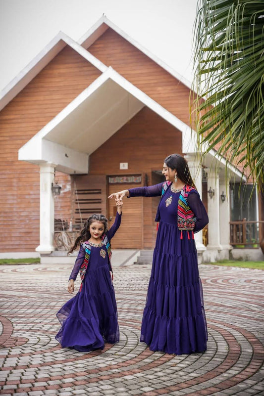 BLUE FUNCTION SPECIAL GEORGETTE DESIGNER MOTHER DAUGHTER GOWN COLLECTION AT BEST RATE