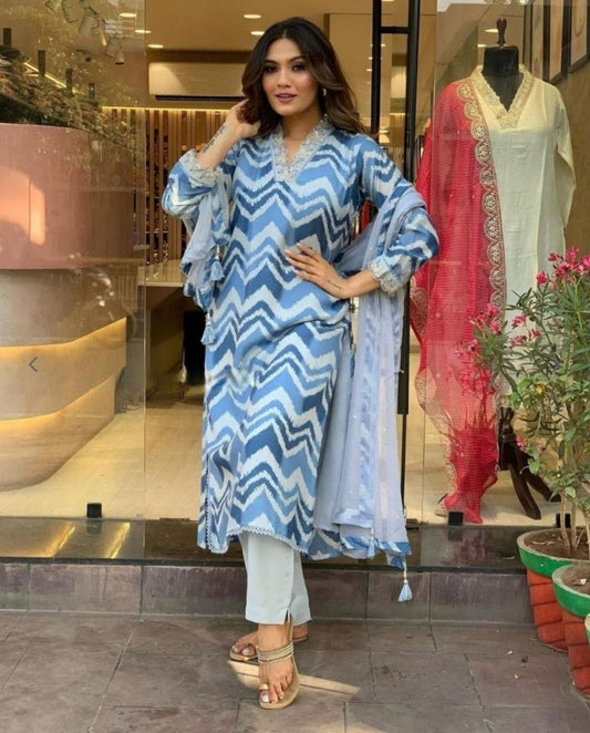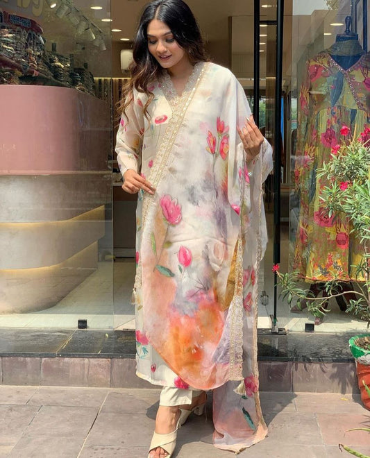 Beautiful Viscose Organza digital print kurti paired with Shantoon pant and pure Viscose organza digital print duppata