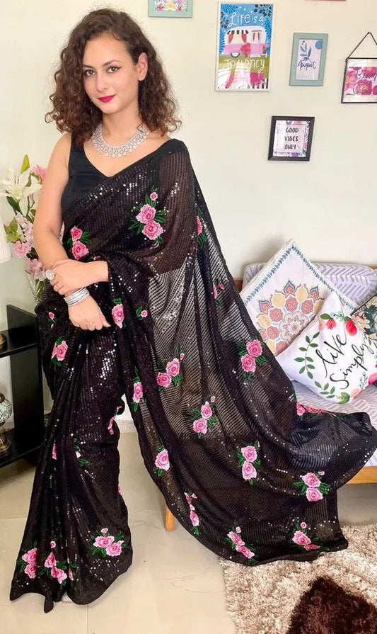 Gorgeous Black Sequin Multi Thread Embroidered Party Wear Saree With Unstitched Blouse