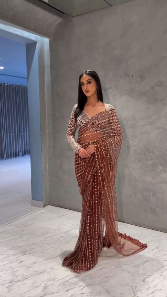 Bollywood Kareena Kapoor Khan Inspired Faux Georgette Saree with Heavy Sequin Embroidery & Cutwork Lace Border