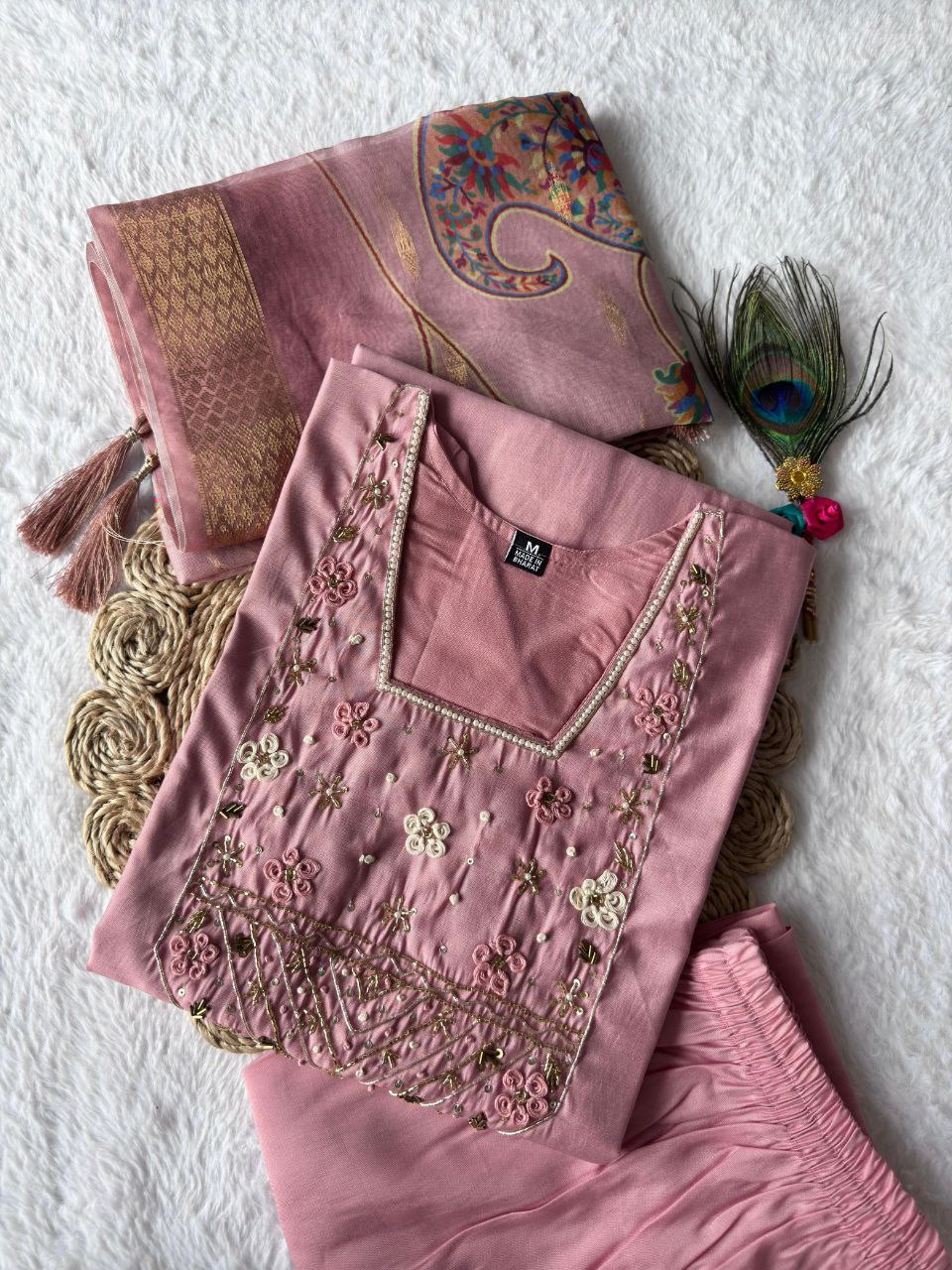 Designers Kurta Pent Set, Premium Roman Silk & Kurta Full Inner Cotton with Hand Work Neckline, Dupatta Heavy Chanderi jacquard With Digital Print With Latkan