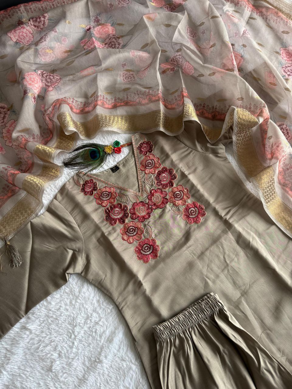 Designers Kurti Pent Dupatta Set, Premium Roman Silk, Dupatta Hevay Chanderi With Digital Print With Latkan and Kurta Embroidery MultI With Sequence Work with Cotton Inner (Full)