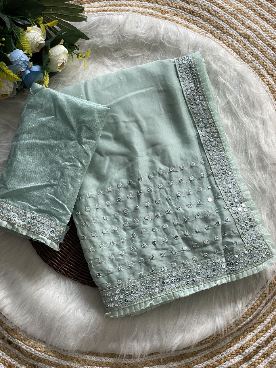 Heavy Tissue Organza Saree with Sequins Embroidery & Frill Lace Border, Silk Blouse for Weddings & Parties