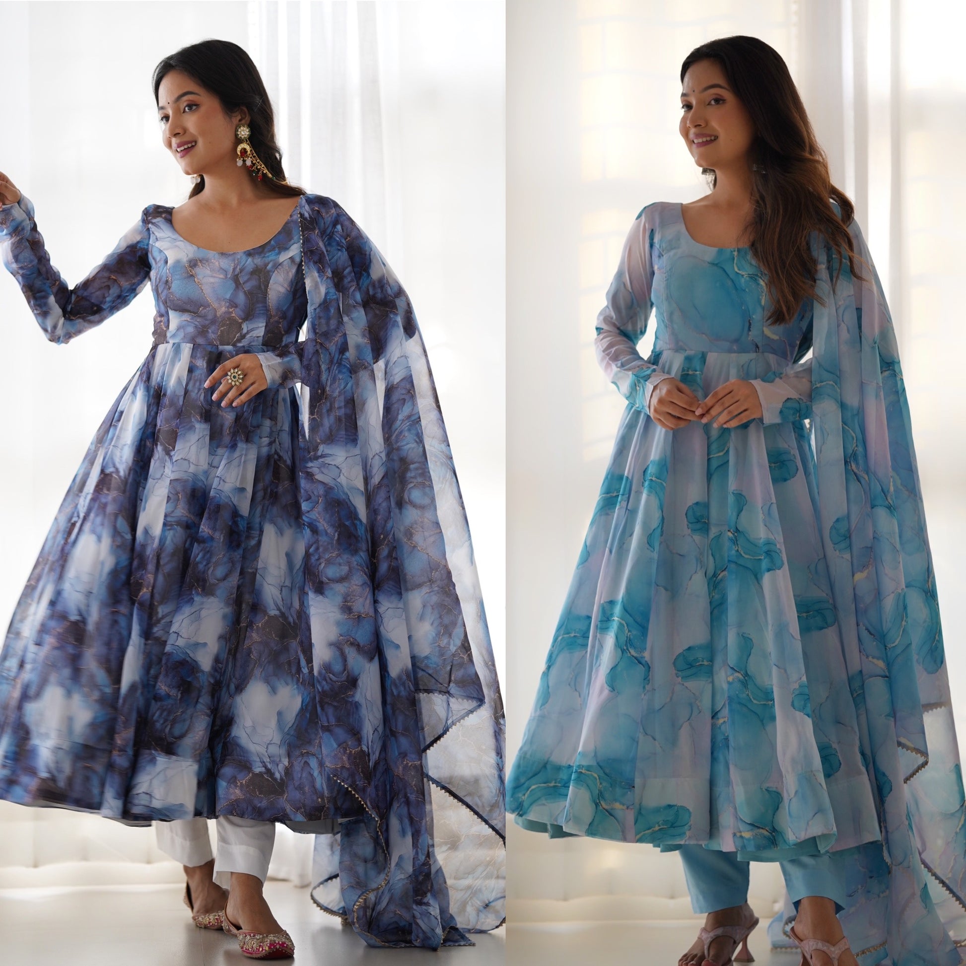 PURE SOFT ORGANJA SILK MARBLE PRINT FABRIC FULLY FLAIR KALI PATTERN AND CANVAS PATTA WITH DUPPTA SET,PENT READY TO WEAR